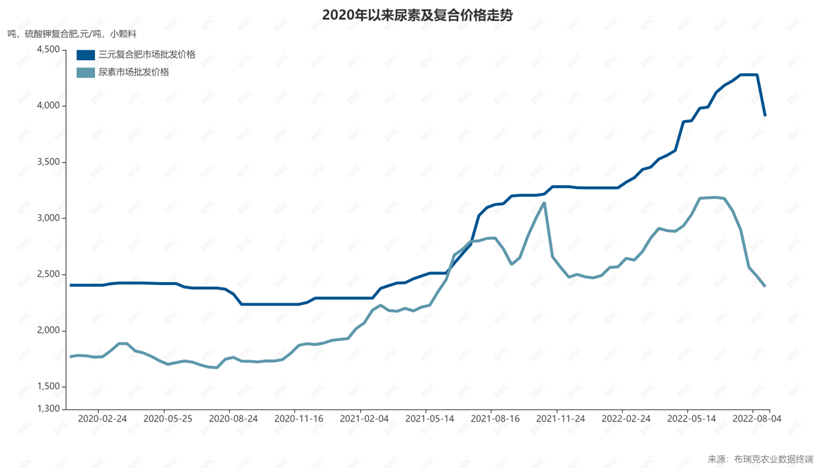 8月24日,据国家统计局数据显示,8月中旬,尿素价格为2340.9元/吨,复合肥价格为3910元/吨。与6月中旬的价格高点相比,分别下降了836.8元/吨和275元/吨。今年1月上旬,二者价格则分别为2492.5元/吨和3272.5元/吨。