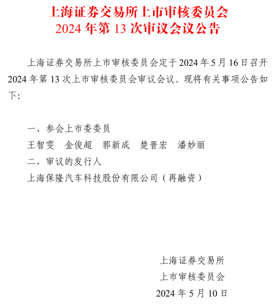 与此同时,保隆科技也将迎来其公开发行可转债项目的审议。该公司主要从事汽车智能化和轻量化产品的研发、制造和销售,此次拟发行可转债募集资金不超过13.9亿元。
