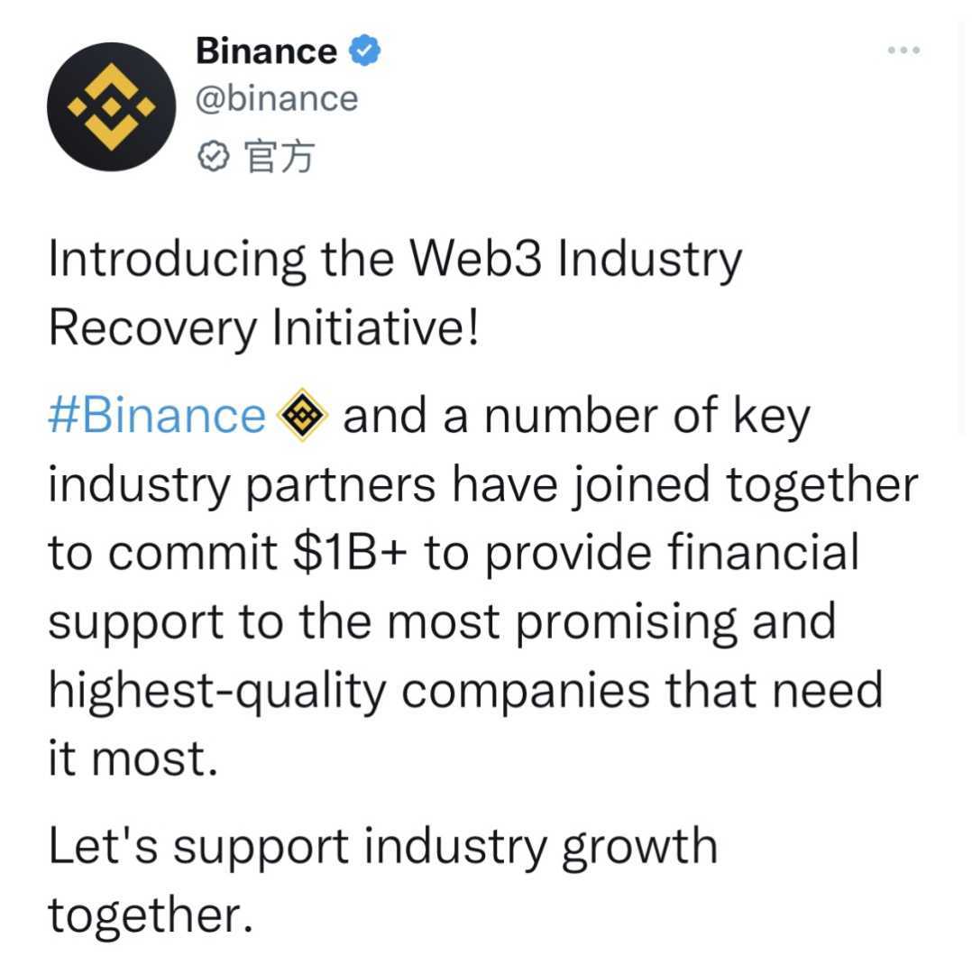 币安通过官方渠道发布了与行业复苏计划相关的推文,进一步明确了其立场和计划细节。