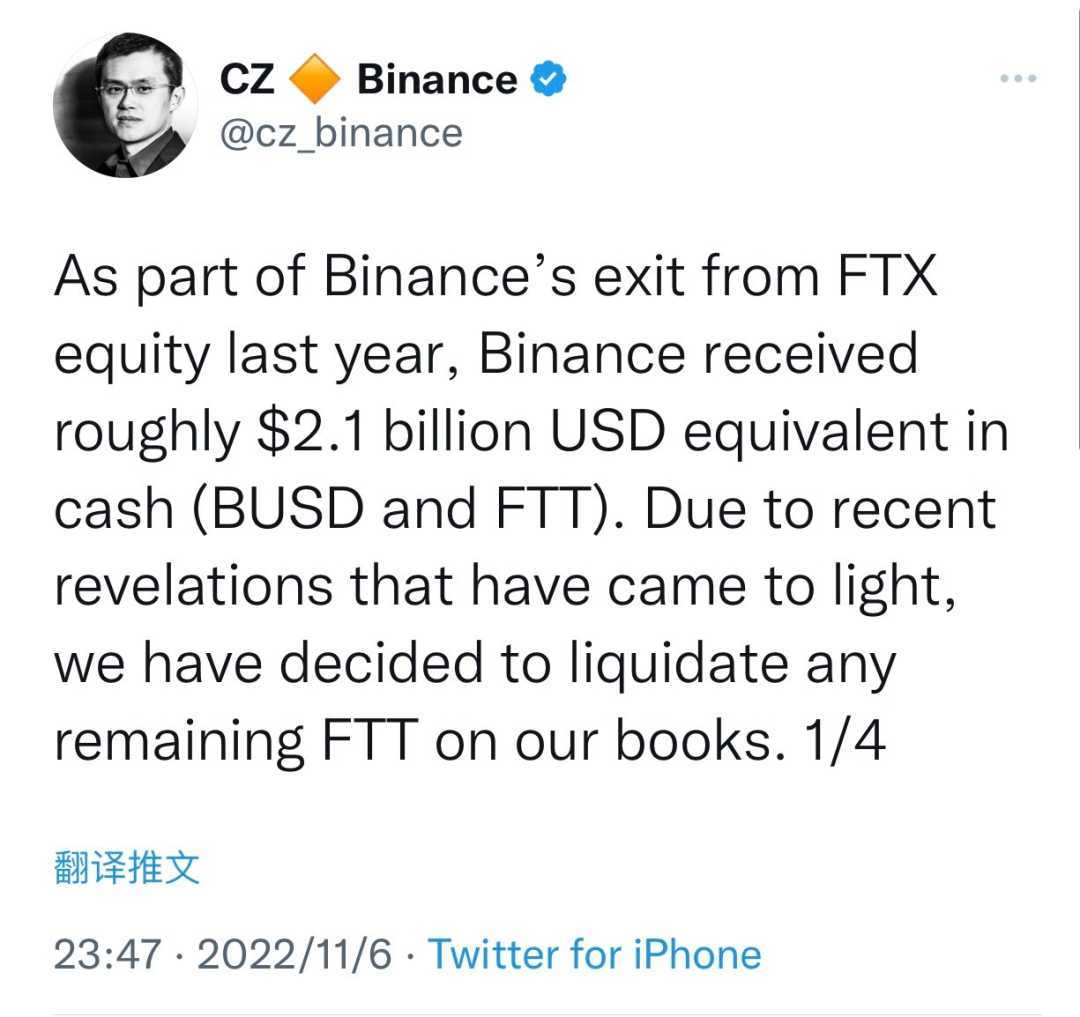 然而,尽管币安牵头设立行业复苏计划,赵长鹏在FTX破产事件中的角色仍备受争议。有外媒指出,市场对FTX的恐慌情绪始于赵长鹏的一条推文。他在11月6日发布的推文中表示,由于最近揭露的真相,币安决定清算所有自持的FTT(当时约为5.3亿美元)。这一推文加剧了市场对FTX的担忧,并引发了流动性危机。