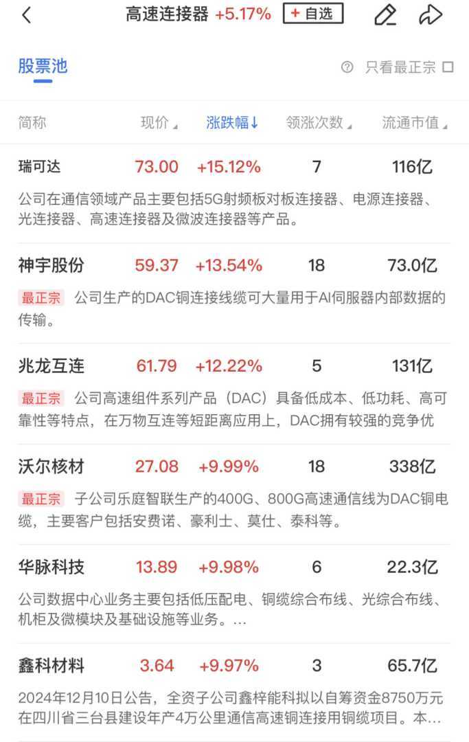 在板块方面,铜高速连接概念再度爆发,沃尔核材、华脉科技、金科材料等个股涨停,瑞可达、神宇股份、兆龙互连等个股涨幅超过10%。