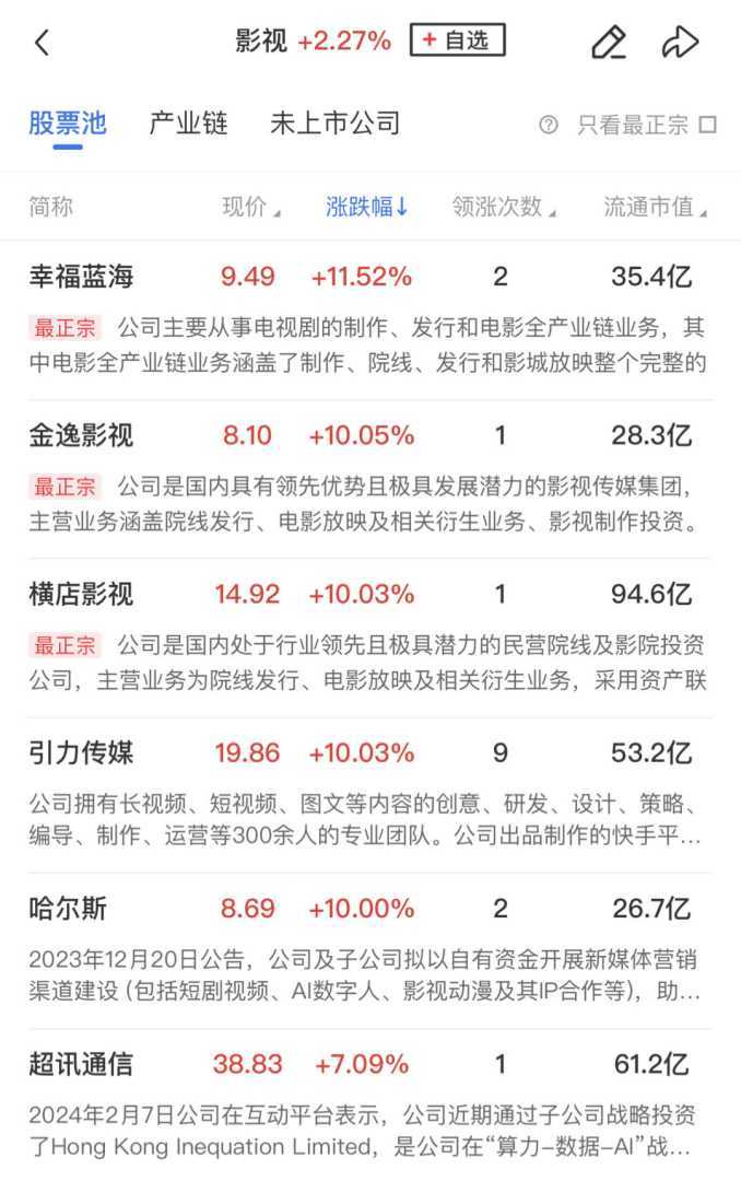 中原证券研报指出,短期内应关注2025年春节档的表现。考虑到春节档作为全年最重要的档期之一,能够在短时间内释放大量票房能量,吸引了众多优质国产影片定档。叠加多地的观影补贴政策,有望进一步刺激观众走进影院,释放电影消费潜力。如果春节档票房表现超预期,有望推动影视板块业绩修复及估值回升。
