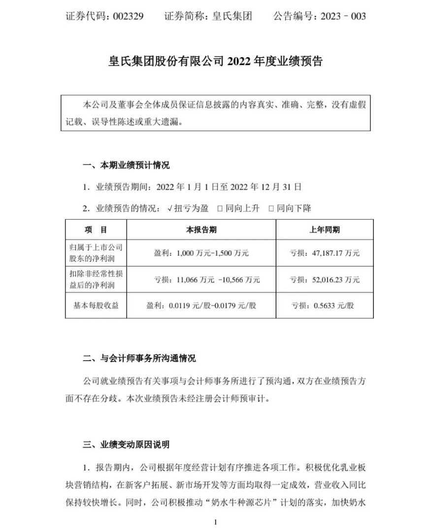 此外,皇氏集团还披露了2022年业绩预告,预计全年归属于上市公司股东的净利润为1000万元至1500万元,同比实现扭亏为盈。这一业绩的改善主要得益于公司乳业板块营销结构的优化以及新客户和新市场的开发。