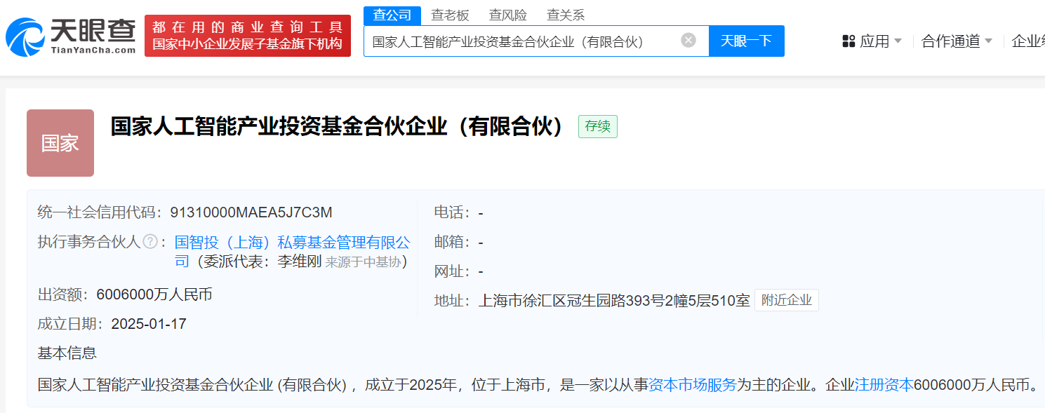 国家人工智能产业投资基金合伙企业于1月17日成立,出资额高达600.6亿元,合伙人包括国智投(上海)私募基金管理有限公司和国家集成电路产业投资基金三期股份有限公司,旨在推动人工智能技术研发与应用,加速产业升级。