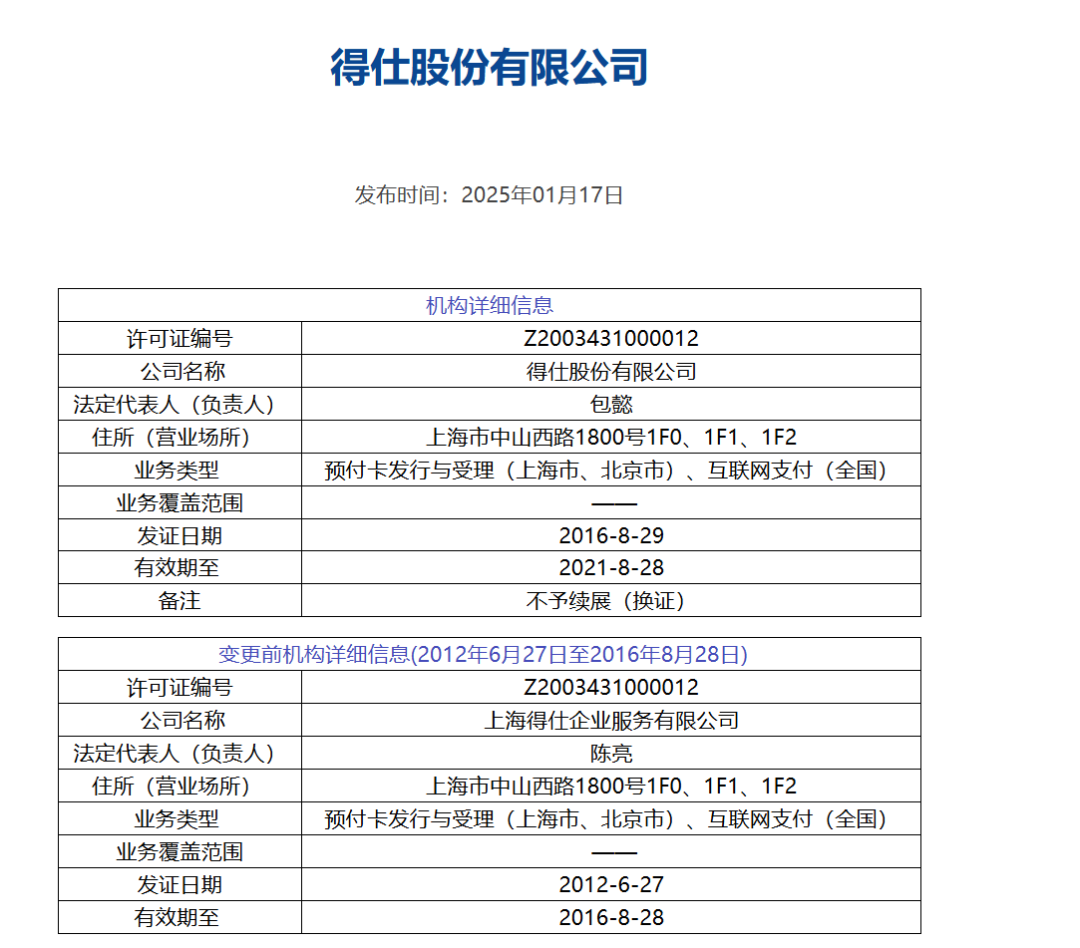得仕股份有限公司,作为上海地区最早取得第三方支付业务许可证的企业之一,其业务涵盖预付卡发行与受理(上海市、北京市)、互联网支付(全国)。然而,原牌照有效期至2021年8月后,得仕股份并未成功续展。