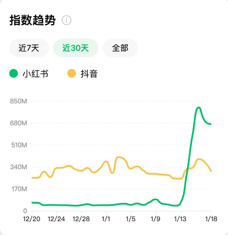 微信指数显示,1月14日小红书的微信指数瞬间从平日的千万量级攀升至2.74亿,随后又在1月16日攀升至8亿的高点,几乎是同一天抖音微信指数的两倍。这一数据无疑证明了小红书在国内市场上的巨大影响力。