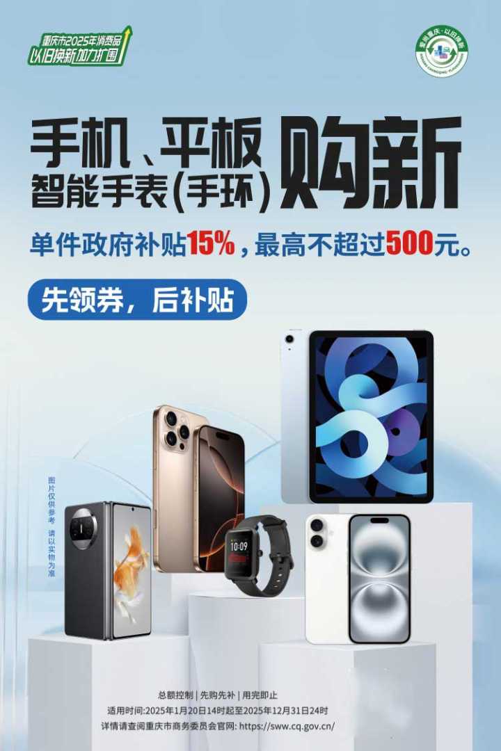 为充分利用春节假期这一消费黄金期,进一步激发手机、平板、智能手表(手环)等电子产品的市场消费活力,重庆市商务委员会于1月20日正式发布了《关于实施2025年手机、平板、智能手表(手环)购新补贴政策的通知》(渝商务〔2025〕21号),标志着该市将正式启动新一轮的电子产品购新补贴政策。