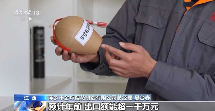 萍乡市金坪烟花制造有限公司总经理夏台春手持一款精美的礼花弹表示,预计到年前,公司的出口额能达到1000万元。