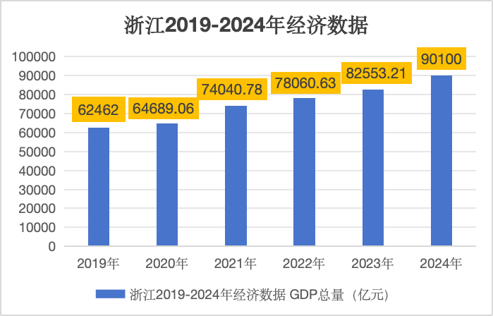 从经济规模的发展历程来看,浙江的GDP总量在2021年突破7万亿元,两年后即2023年突破8万亿元,而今仅时隔一年便再次迈上9万亿元的新台阶。这一连串的突破,无疑彰显了浙江经济的稳健与活力。