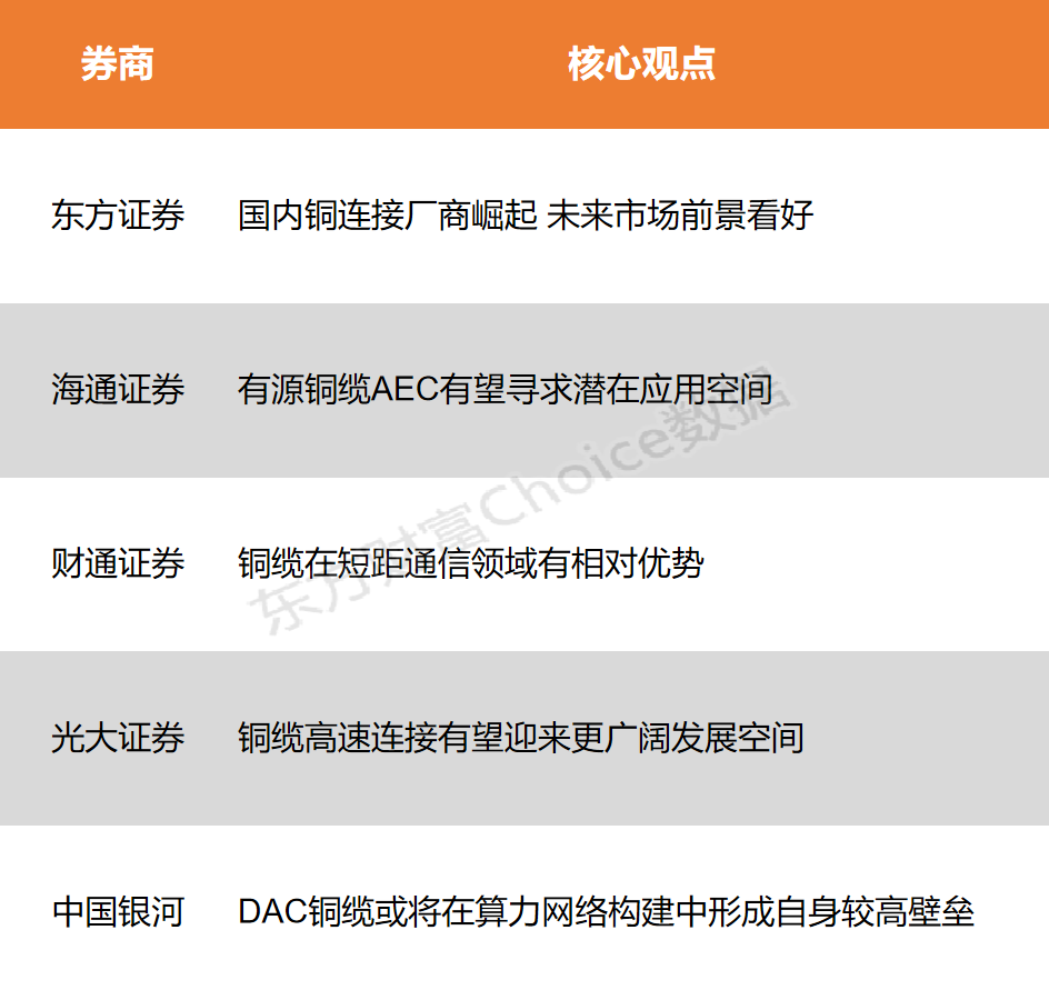- 光大证券:指出在新一轮AI数据中心加速发展以及科技巨头引领下,铜缆高速连接技术有望凭借低成本高速传输等独特优势,在全球数据中心市场迎来更广阔的发展空间。建议关注相关材料供应商、设备生产商、系统集成服务商等产业链各环节。