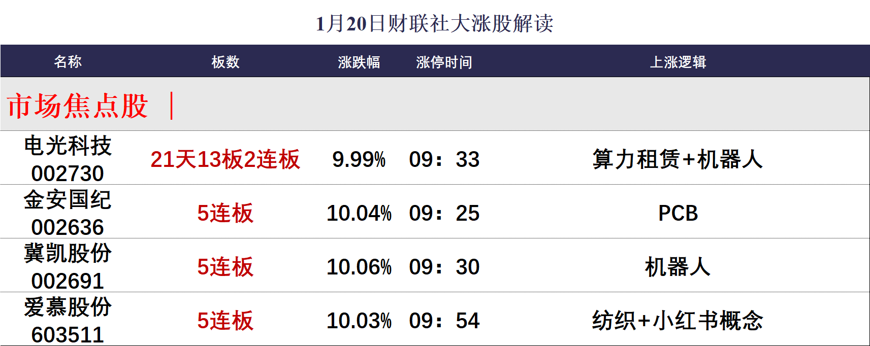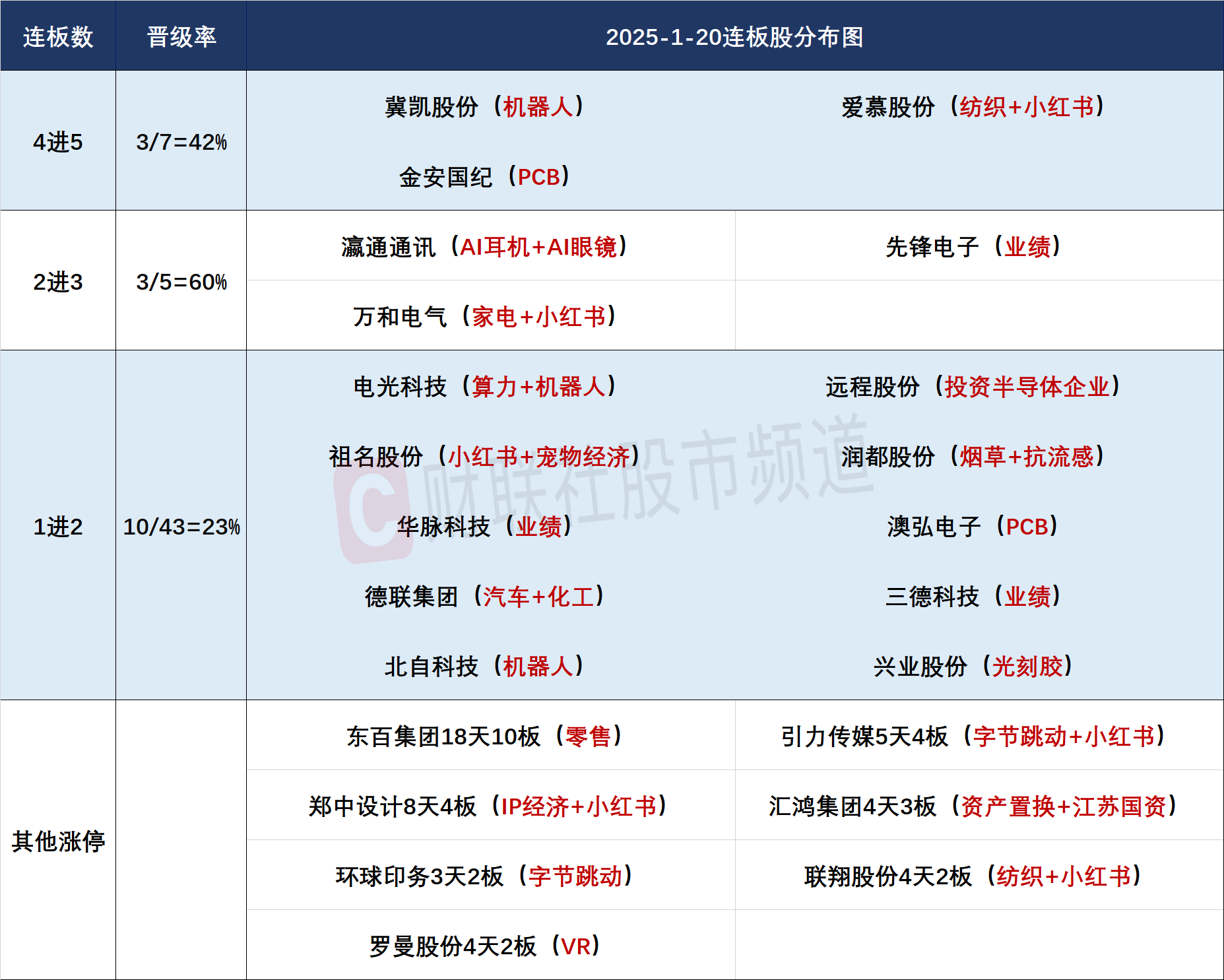 财联社1月20日讯,今日A股市场表现活跃,共有71只股票涨停,但同时也有35只股票炸板,整体封板率为67%。冀凯股份、爱慕股份、金安国纪等个股实现5连板,瀛通通讯、先锋电子、万和电气等则达到3连板。市场热点快速轮动,沪深两市全天成交额达到1.18万亿元,较前一交易日增加474亿元。全市场超过3600只个股上涨,显示出市场的整体强势。