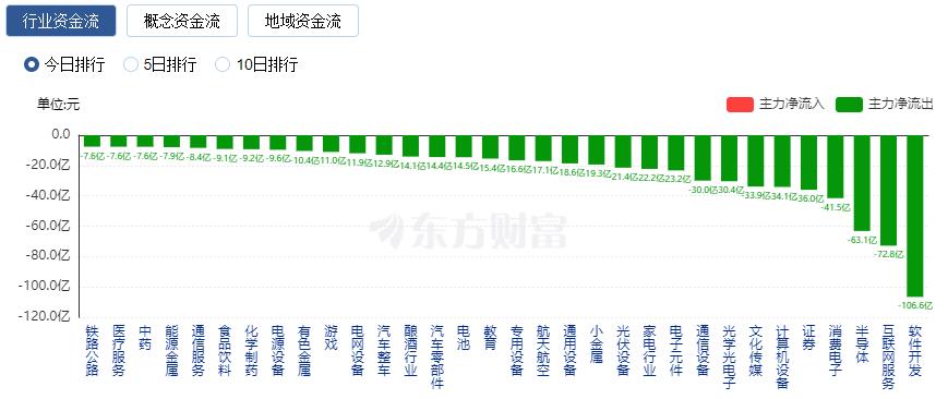 在行业资金流向方面,银行、煤炭行业、工程机械等净流入排名靠前,其中银行净流入39.77亿。而软件开发、互联网服务、半导体等则净流出排名靠前,其中软件开发净流出106.6亿元。