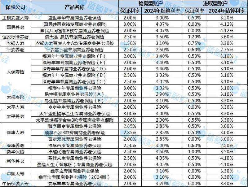 整体来看,当前的专属商业养老保险产品主要分为稳健型和进取型两类账户。稳健型账户的保证利率普遍较高,多设定为2%、2.5%,个别产品高达3%;而进取型账户的保证利率则主要集中在0%和0.5%两个水平。