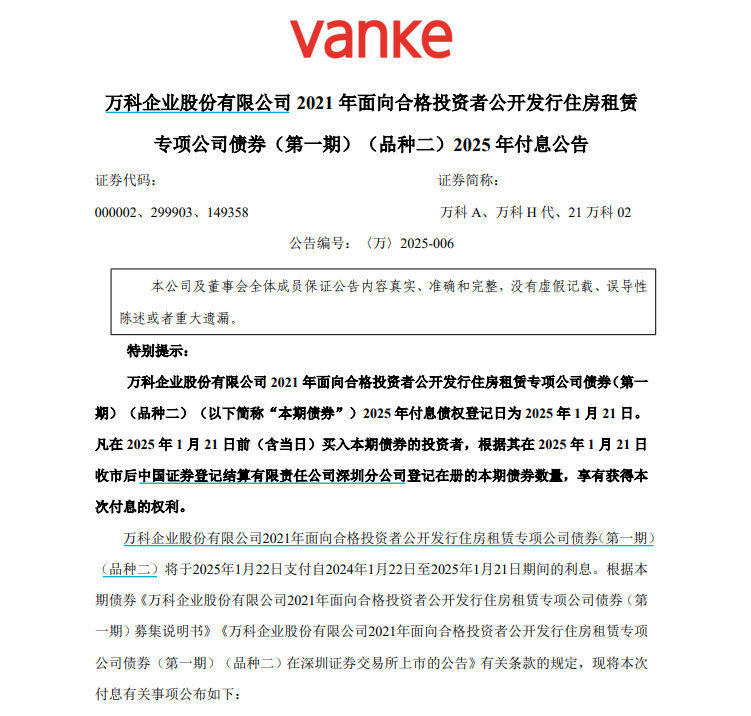 公告详细指出,“21万科02”的2025年付息债权登记日设定为2025年1月21日。所有在2025年1月21日之前(含当日)购入本期债券的投资者,将有权依据其在2025年1月21日收市后中国证券登记结算有限责任公司深圳分公司所登记的“21万科02”债券数量,享受此次付息的权利。