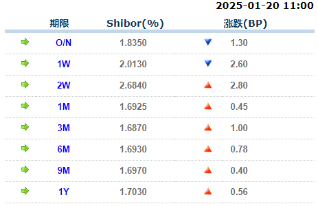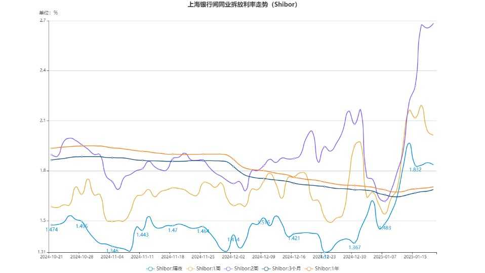 与此同时,上海银行间同业拆放利率(Shibor)各品种呈现出窄幅震荡的态势,其中隔夜和7天品种出现小幅下跌。具体来看,隔夜Shibor下跌1.30个基点,报收于1.8350%;7天Shibor下跌2.60个基点,报收于2.0130%;而14天Shibor则上涨2.80个基点,报收于2.6840%。(见图一)
