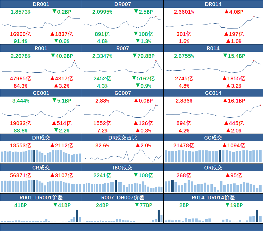 在银行间质押式回购市场方面,非银间品种继续呈现明显下跌趋势,R007成交占比急剧下降至4.3%。具体来看,DR001和R001的加权平均利率分别下行0.2个基点和40.9个基点,报收于1.8573%和2.2678%,成交额分别增加了1837亿元和4317亿元;DR007和R007的加权平均利率分别下行2.5个基点和79.8个基点,报收于2.0995%和2.3347%,成交额分别减少了108亿元和5162亿元;DR014和R014的加权平均利率则分别上行4.0个基点和下行15.4个基点,报收于2.6601%和2.6755%,成交额分别增加了197亿元和1855亿元。(见图二)