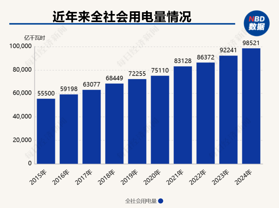 据官方数据显示,2024年我国全社会用电量达到了98521亿千瓦时,相比去年增长了6.8%。其中,规模以上工业发电量占据主导地位,总量为94181亿千瓦时。