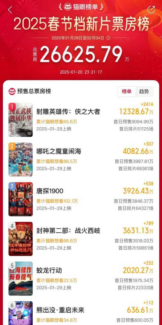 截至目前,春节档预售总票房已突破2.6亿元,其中武侠电影《射雕英雄传:侠之大者》以1.23亿元的预售票房遥遥领先,成为春节档的最大热门。紧随其后的是《哪吒之魔童闹海》《唐探1900》和《封神第二部:战火西岐》,预售票房均超过3500万元。而合家欢动画电影《熊出没·重启未来》的预售票房虽仅为636.61万元,但作为春节档的常客,其市场表现依然值得期待。