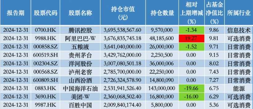 作为张坤的代表作基金,易方达蓝筹精选的持仓情况备受关注。截至2024年四季度末,该基金资产净值为374.98亿元,较三季度末缩水63.37亿元。尽管股票仓位略有下降,但前十大重仓股持股集中度小幅上升。在调仓持股方面,该基金增持了阿里巴巴,减持了中国海洋石油、美团等个股。
