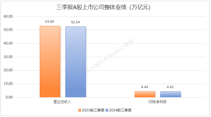 总体来看,2024年前三季度,这5356家A股上市公司合计实现了52.54万亿元的营业总收入,尽管同比下降了0.87%;同时,合计实现了4.41万亿元的归母净利润,同比下降0.53%。