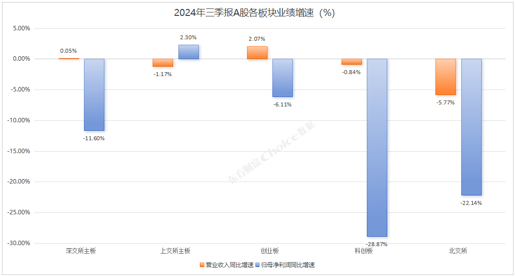 分板块来看,深交所主板和创业板在营业收入上实现了同比增长,而上交所主板则在归母净利润上实现了同比增长。