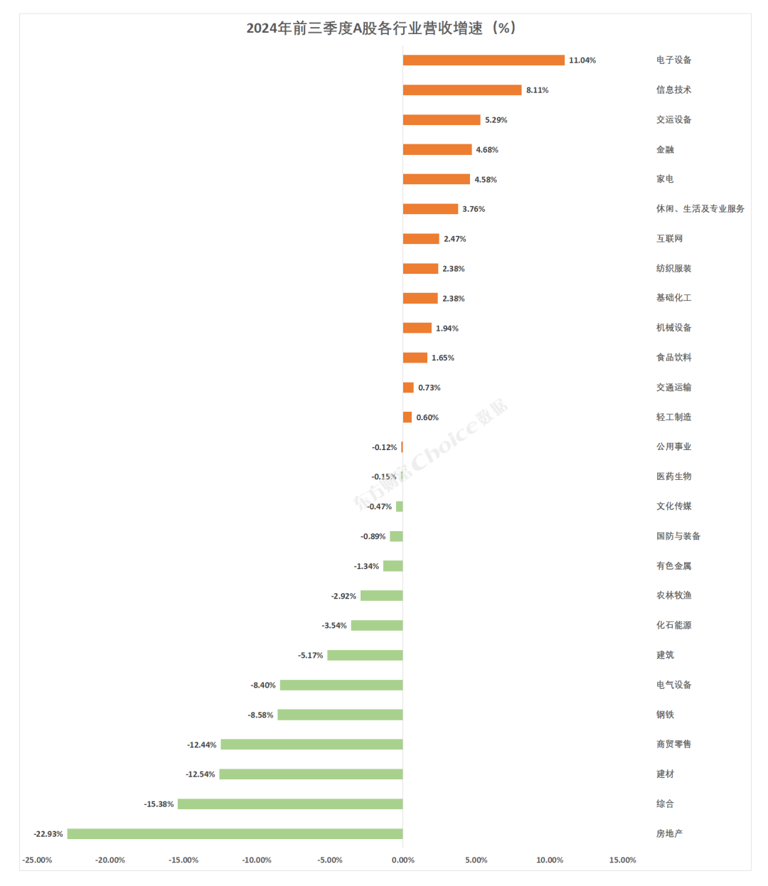 在行业营收增速方面,27个东财一级行业中,电子设备行业以11.04%的增速领跑,信息技术和交运设备行业紧随其后,分别实现了8.11%和5.29%的营收增速。相比之下,房地产、综合、建材和商贸零售行业的营收增速均低于-10%。