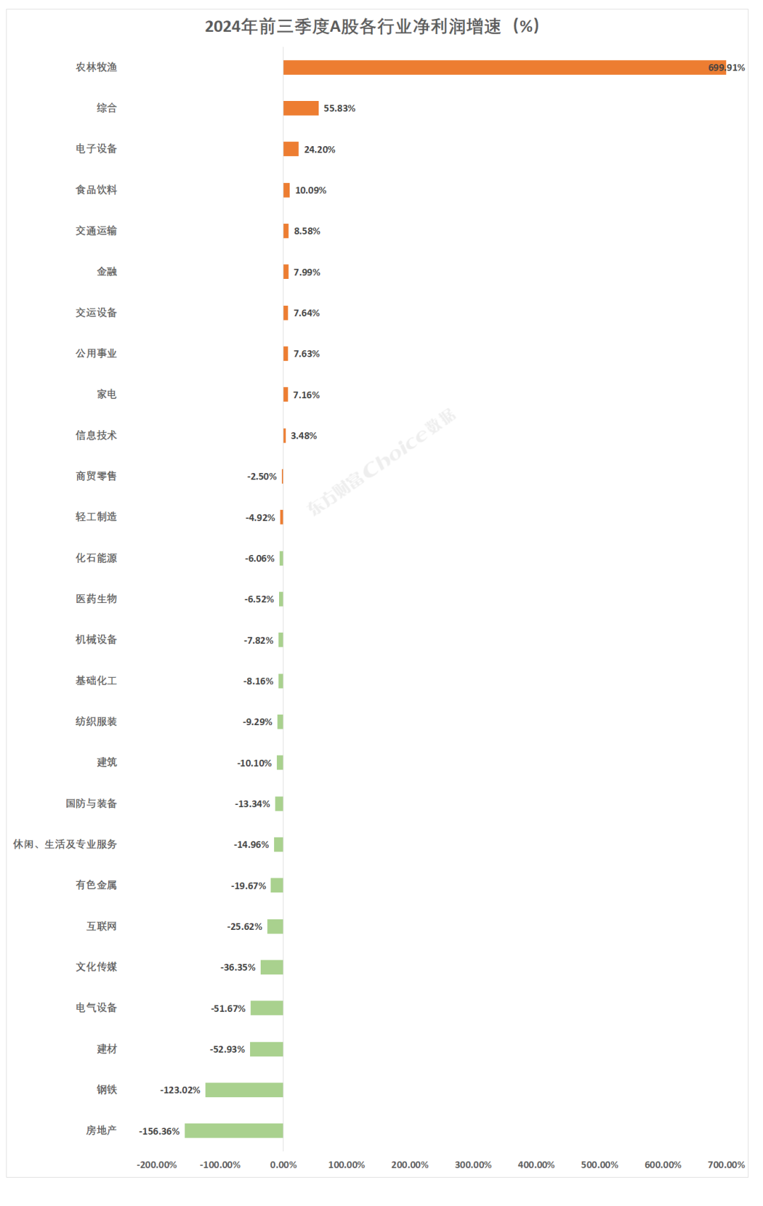 在净利润增速方面,农林牧渔行业以惊人的699.91%增速位居首位,综合和电子设备行业也分别实现了55.83%和24.20%的增长。然而,房地产和钢铁行业的净利润增速却同比下降超过100%。