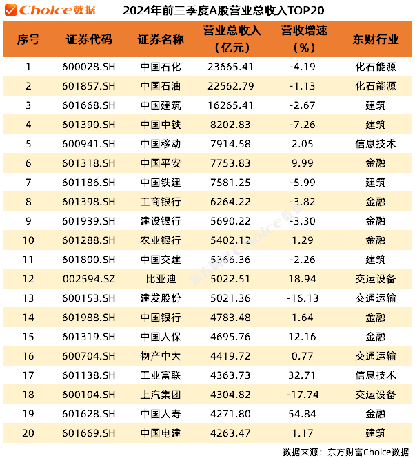 1.营收TOP20:2024年前三季度,中国石化以23665.41亿元的营业总收入稳居榜首,中国石油和中国建筑紧随其后,营业总收入均超过万亿元。