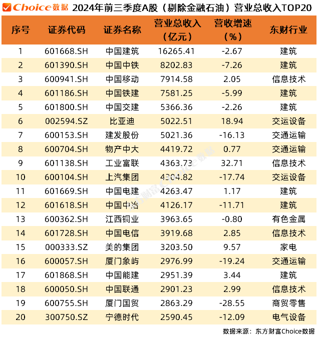 剔除金融石油行业后,中国建筑、中国中铁和中国移动在营业总收入上位列前三。