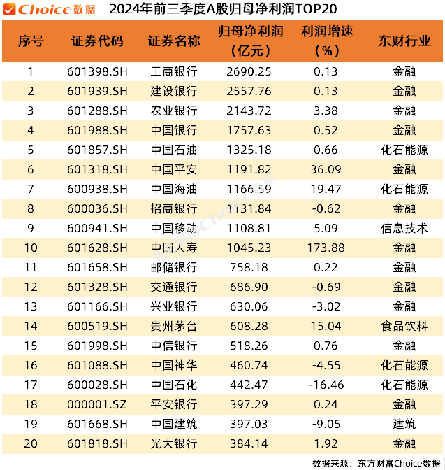 2.净利润TOP20:在归母净利润方面,工商银行以2690.25亿元高居榜首,建设银行、农业银行和中国银行也均超过1500亿元。