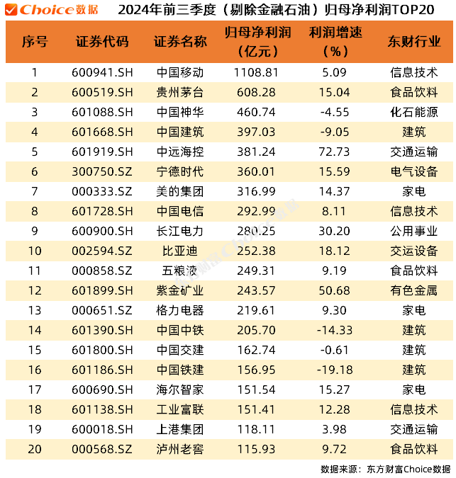 剔除金融石油行业后,中国移动、贵州茅台和中国神华在归母净利润上排名前三。