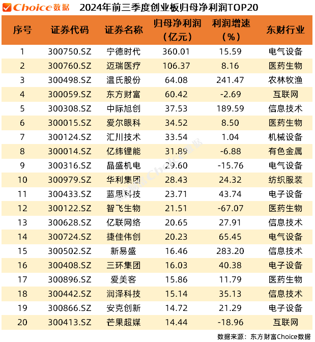 创业板方面,宁德时代以360.01亿元的归母净利润成为创业板“盈利王”,迈瑞医疗和温氏股份分列第二和第三。