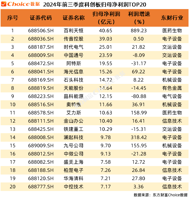科创板“盈利王”则是百利天恒,净利润达到40.65亿元,传音控股和时代电气紧随其后。