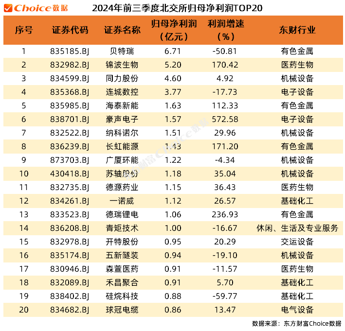 北交所方面,贝特瑞实现归母净利润6.71亿元,位居榜首,锦波生物、同力股份和连城数控的归母净利润也均在3亿元以上。