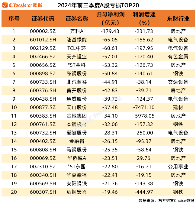 3.亏损TOP20:2024年前三季度,有19家上市公司的归母净利润亏损超过20亿元。