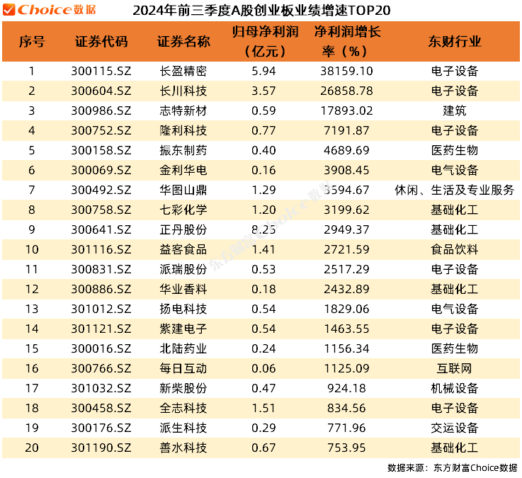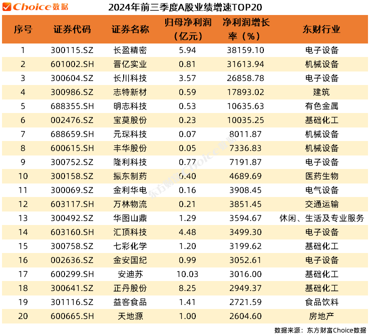 4.业绩增速TOP20:在业绩增速方面,长盈精密以38159.10%的增速位居榜首,晋亿实业、长川科技、志特新材、明志科技和宝莫股份的增速也均超过10000%。