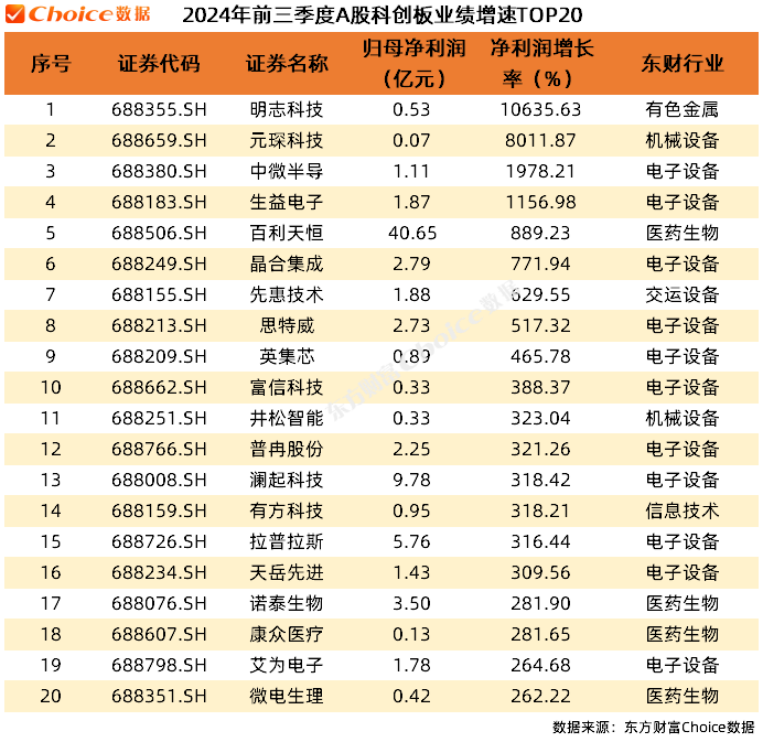 科创板方面,明志科技的归母净利润同比增速最高,达到10635.63%。