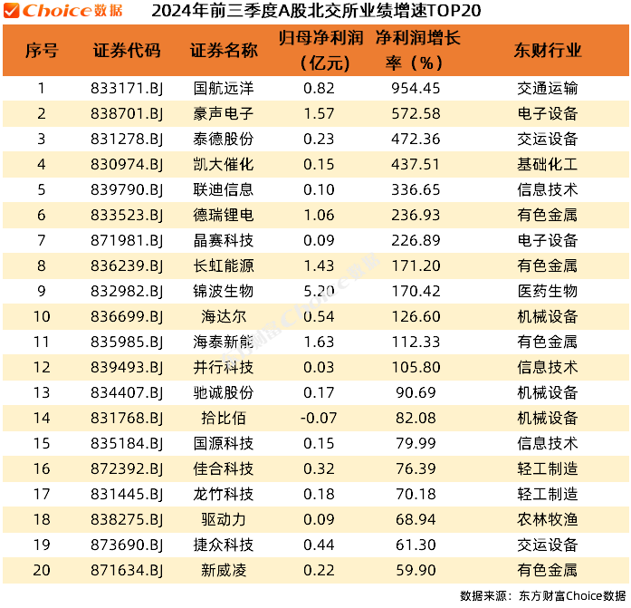 北交所个股中,国航远洋以954.45%的净利润同比增速位列第一。