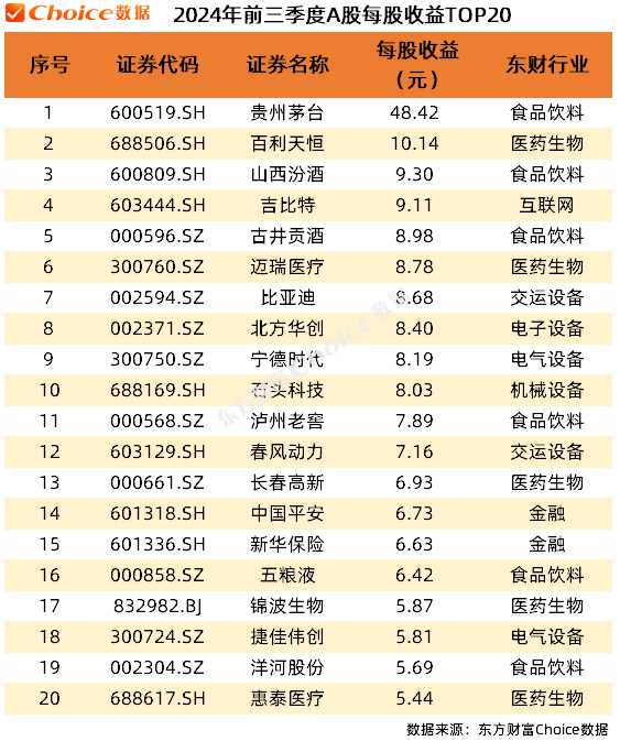 5.每股收益TOP20:在每股收益方面,贵州茅台以48.42元的基本每股收益位居榜首,百利天恒、山西汾酒和吉比特紧随其后。