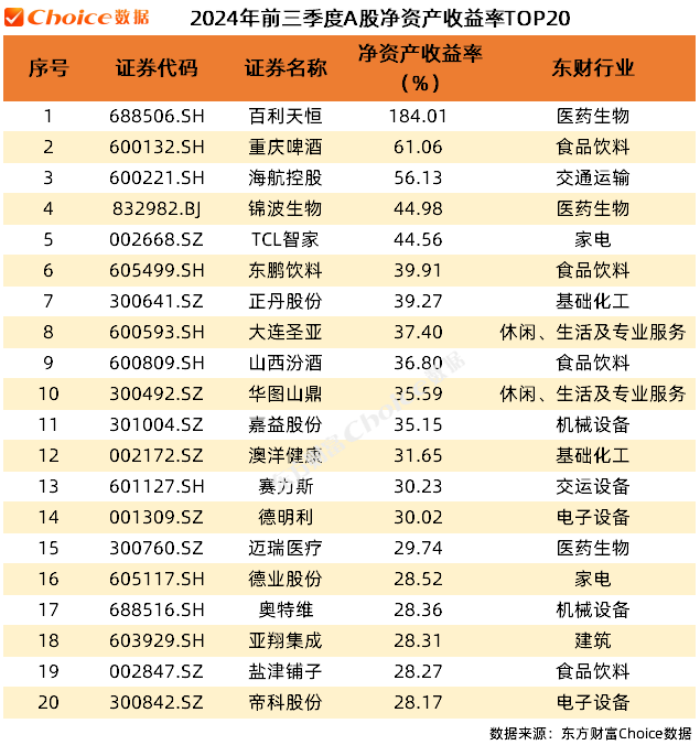 6.净资产收益率TOP20:在加权净资产收益率方面,百利天恒、重庆啤酒和海航控股位列前三。
