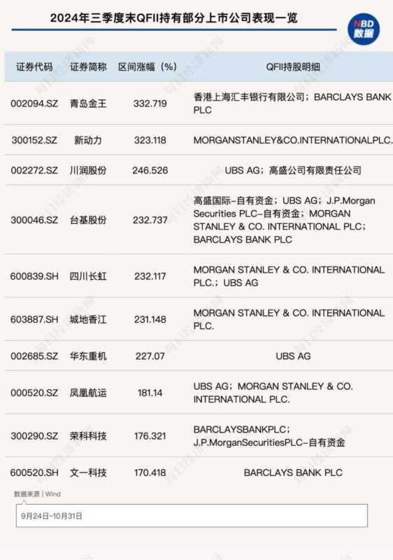 QFII的选股能力也得到了市场的验证。数据显示,QFII三季度共计持有760只个股,其中31只个股在9月24日至10月31日期间的涨幅超过了100%。青岛金王、新动力和川润股份等市场大牛股,QFII都已在三季度潜伏其中。青岛金王的股价涨幅更是超过了330%,成为市场关注的焦点。