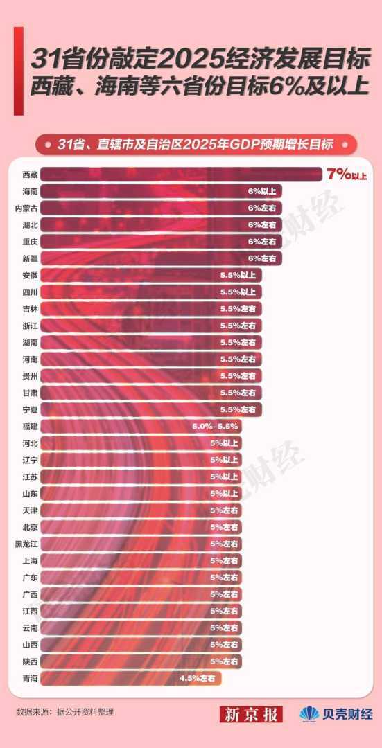 截至2025年1月20日,全国31个省份的两会已悉数落幕,各自公布了2025年的经济增长目标。新京报贝壳财经记者经过细致梳理发现,西藏自治区的经济增长目标最为雄心勃勃,提出地区生产总值增长7%以上,并力争达到8%。紧随其后的是海南省,其GDP增长目标设定为6%以上。内蒙古、湖北、重庆及新疆亦不甘落后,均提出了GDP增长6%左右的预期目标。