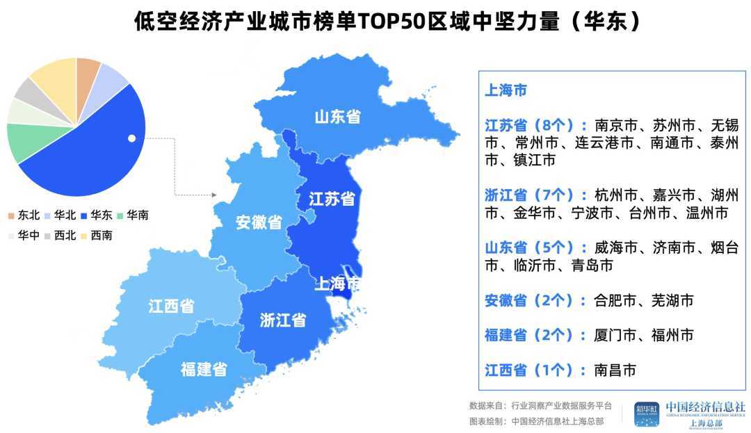 从地域分布来看,华东地区在低空经济TOP50城市中占据了主导地位,上榜城市数量超过26个,包括上海、南京、苏州、杭州等经济发达城市。这些城市凭借强大的经济实力和产业基础,在低空经济领域展现出了强劲的竞争力。