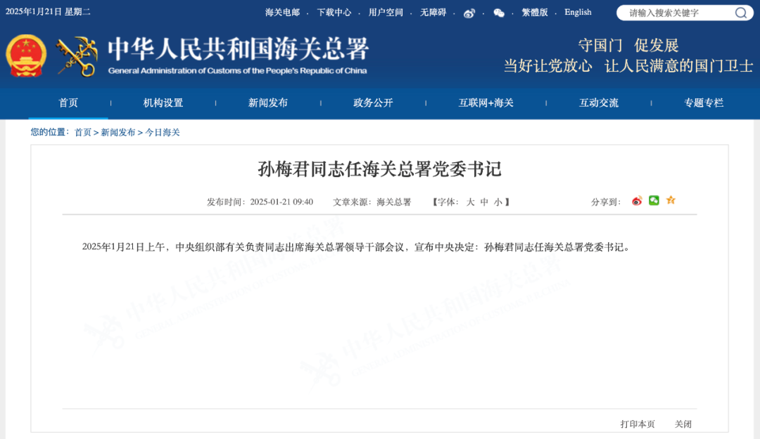 据海关总署官方网站最新消息,2025年1月21日上午,中央组织部相关负责人在海关总署领导干部会议上宣布了一项重要人事任命:孙梅君同志被正式任命为海关总署党委书记。这一决定标志着孙梅君同志将在新岗位上继续发挥其卓越的领导才能。
