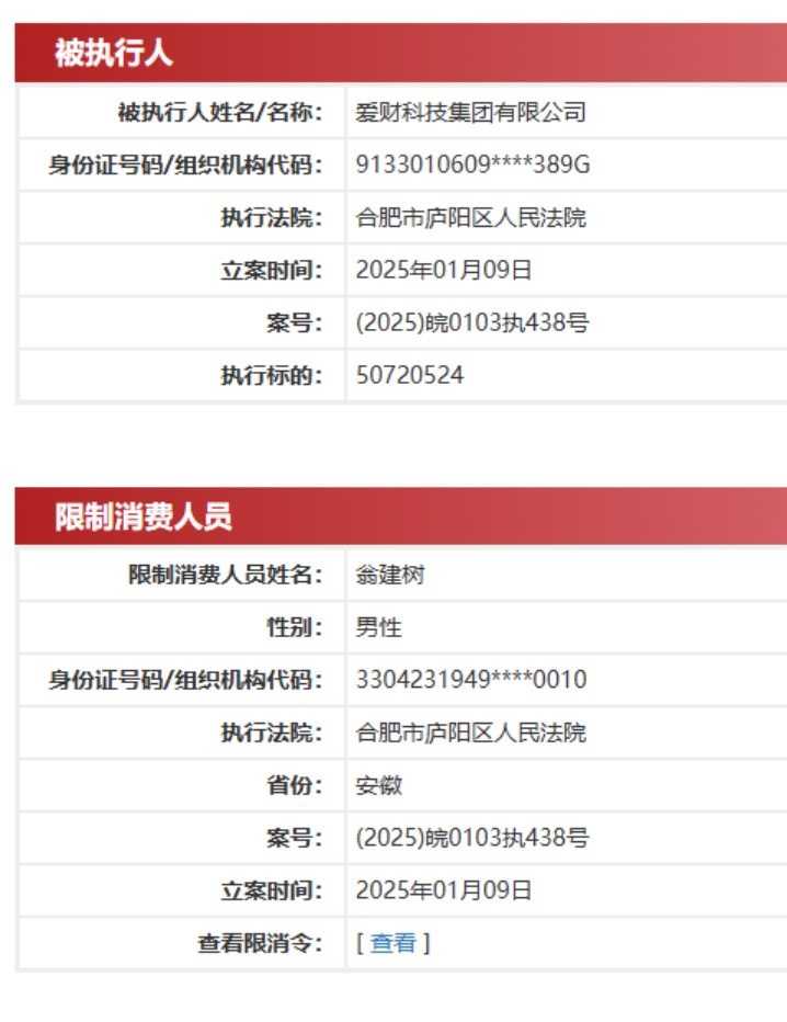 蓝鲸新闻1月21日讯(记者 黄玉洁 张书维)1月21日,蓝鲸新闻从中国执行信息公开网获取到一则重要消息,爱财科技集团有限公司(以下简称“爱财集团”)被列为被执行人,执行标的金额高达5072.52万元。同时,该公司的法定代表人翁建树也被列入了限制消费人员名单。