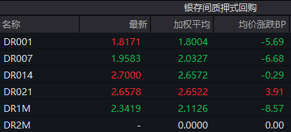 银行间市场回购定盘利率则多数持平。其中,FR001报2.1000%,较上日下行15个基点;FR007报2.4000%,与上日持平;FR014报2.7000%,同样与上日持平。