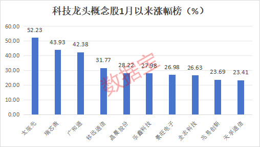 科技龙头股的涨势如虹,自1月以来,多达26只个股累计涨幅超过10%。其中,太辰光累计涨幅超过52%,位居榜首。公司昨日发布公告,预计2024年度归母净利润将达到2.3亿元至2.75亿元,同比增长48.3%至77.32%。业绩增长的主要原因是AI技术的进步推动了全球数据中心建设,进而拉动了光器件产品的持续需求。此外,瑞芯微、广和通等科技龙头股也表现出色,1月以来累计涨幅分别接近44%和42.38%。