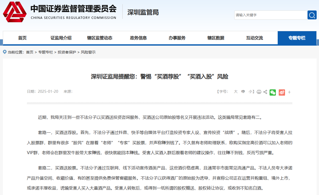 2025年1月20日,深圳证监局正式发布了风险警示公告,郑重提醒广大投资者务必警惕当前市场中盛行的“买酒荐股”与“买酒入股”两大诈骗陷阱。
