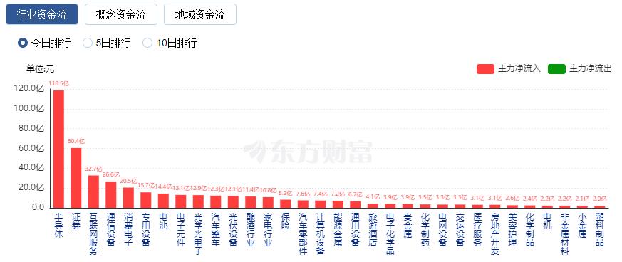 行业资金流向方面,半导体行业净流入高达118.05亿元,位居各行业之首。证券、互联网服务等行业也呈现资金净流入态势。