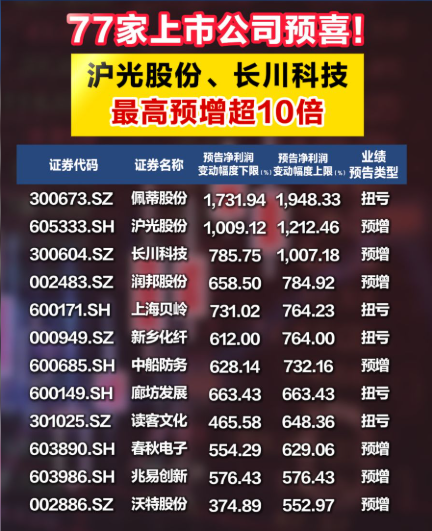 据统计,共有77家上市公司发布2024年业绩预喜公告,其中沪光股份、长川科技净利润增长均超过10倍,业绩表现尤为亮眼。